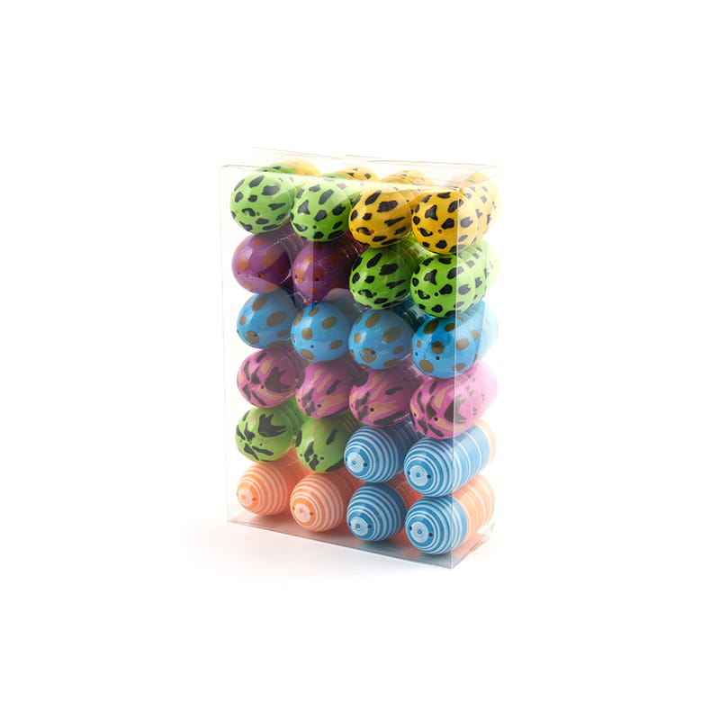 Ova uskrsna tiskana jaja izrađena su od visokokvalitetnog ekološki prihvatljivog PP materijala, sigurnih i netoksičnih, mogu se koristiti bez ikakvih briga. Svako jaje se može ispisati sa svim vrstama lijepih uzoraka, poput emotikona, pruga i drugih željenih uzoraka, boje su svijetle i nisu lako izblijediti. Lopta je puna i okrugla, s osjetljivim rukom, zbog čega ljudi to vole. Bilo da kao praznični ukrasi ili darovi, ovo uskrsno tiskana jaja mogu dodati jedinstvenu atmosferu i radost praznika.